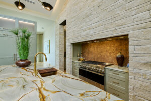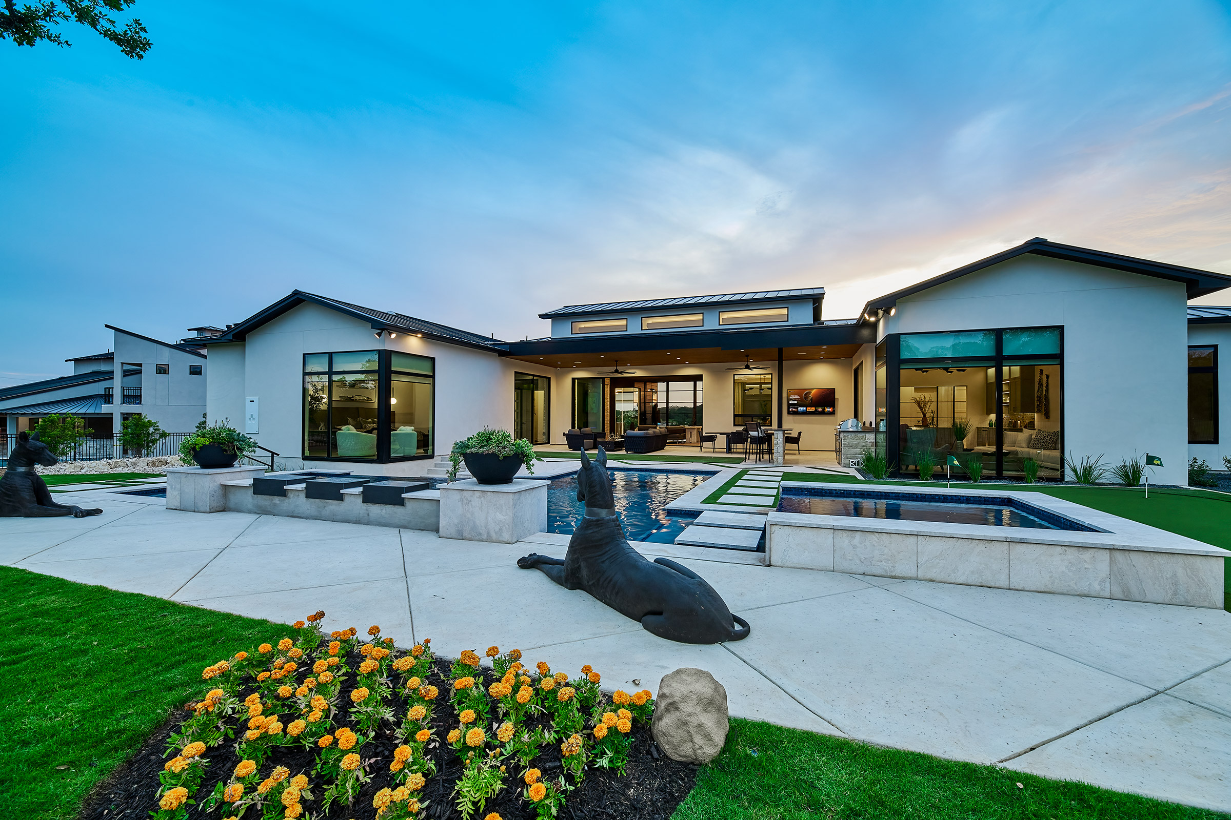We call this style Earthy Modern and it features 4,942 square feet of living space, 4 bedrooms, 5 baths and a 3-car garage. An unforgettable, captivating, and luxurious presence that is family friendly, using hidden detailed touches throughout the home with various textures and light balance is the vision for this home. Warm and cozy with timeless crisp lines and interspersed with natural stone counters, warm pecan wood floors, earthy stone walls carried in from the outside and endless tung and groove patio ceilings reflect timeless elegance.